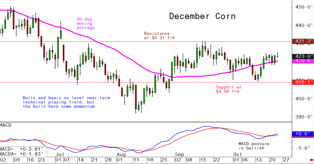 December corn futures--$4.09 1/4 to $4.31 1/4 and a sideways-higher bias