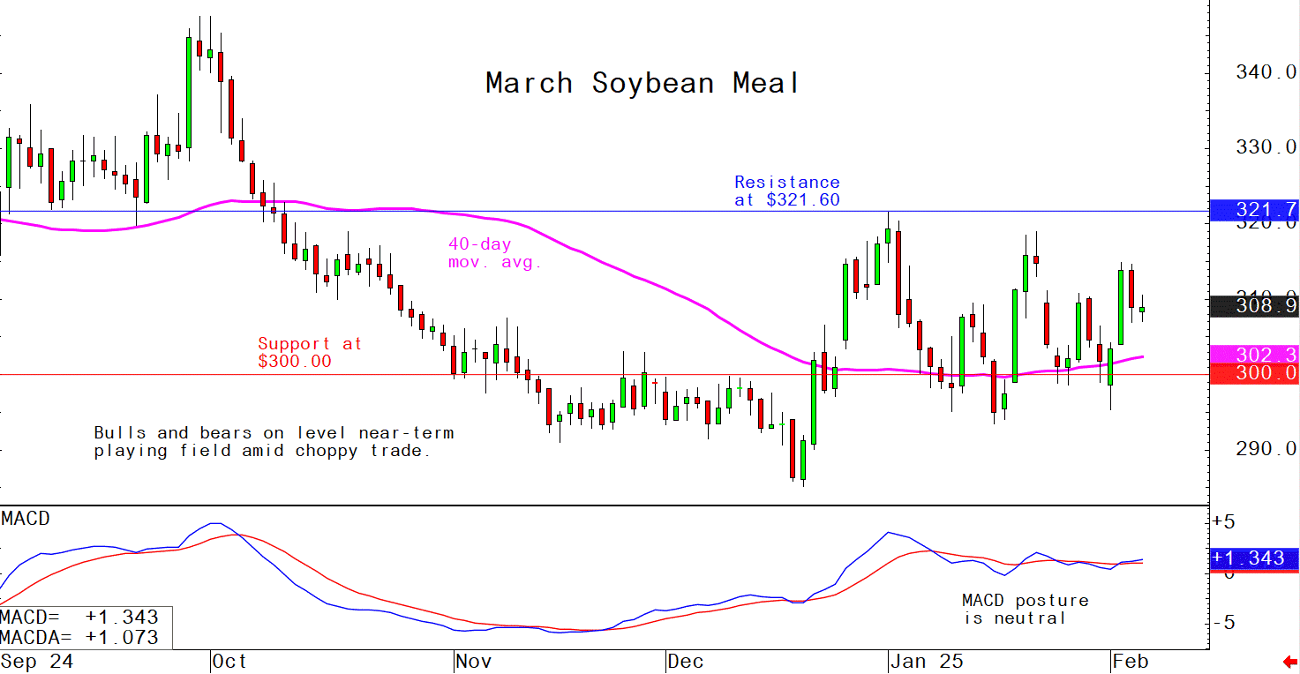March soybean meal futures--$300.00 to $321.60, and with a sideways-higher bias