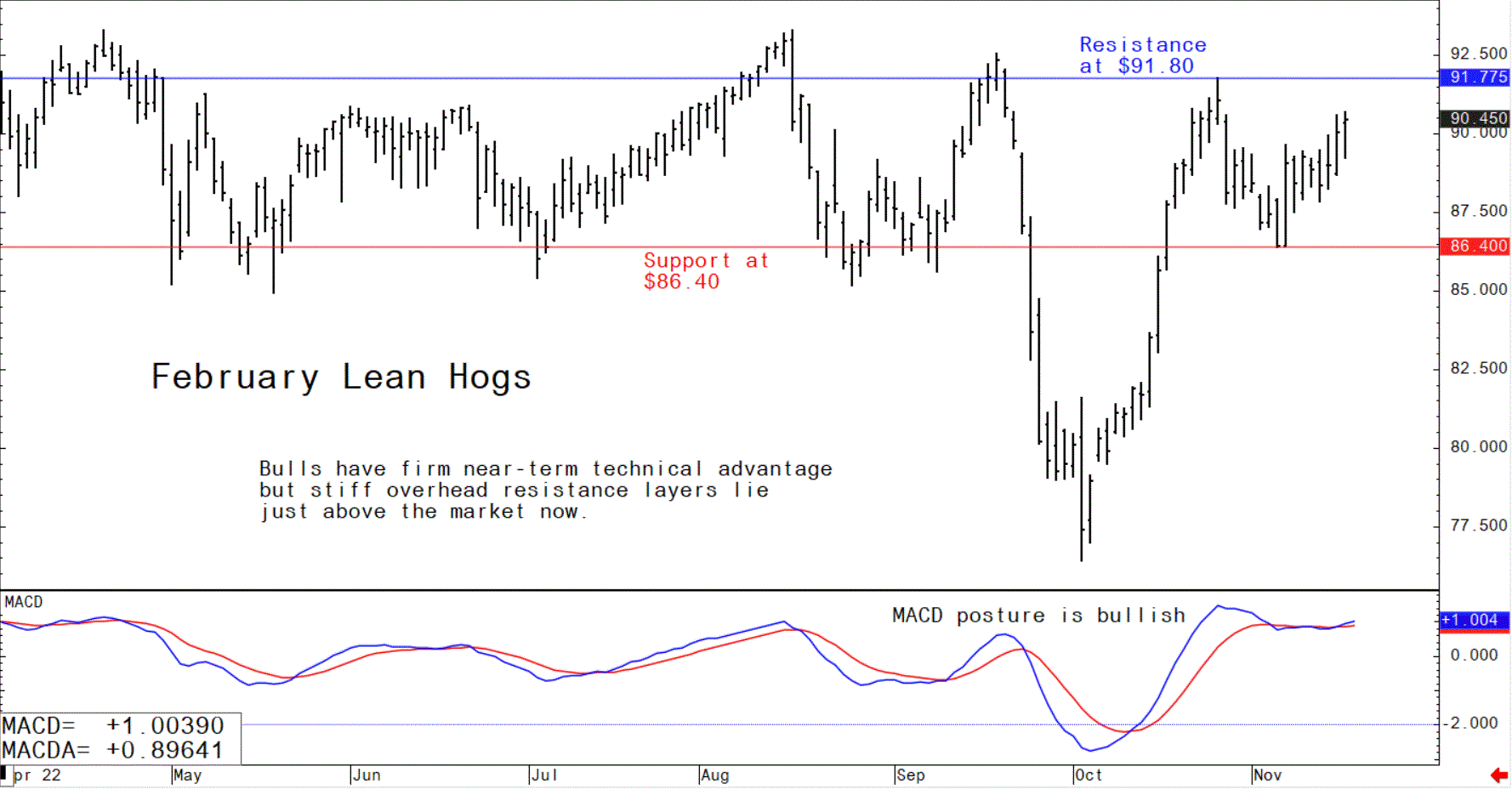 February lean hog futures--$86.40 to $93.30 and with a sideways bias
