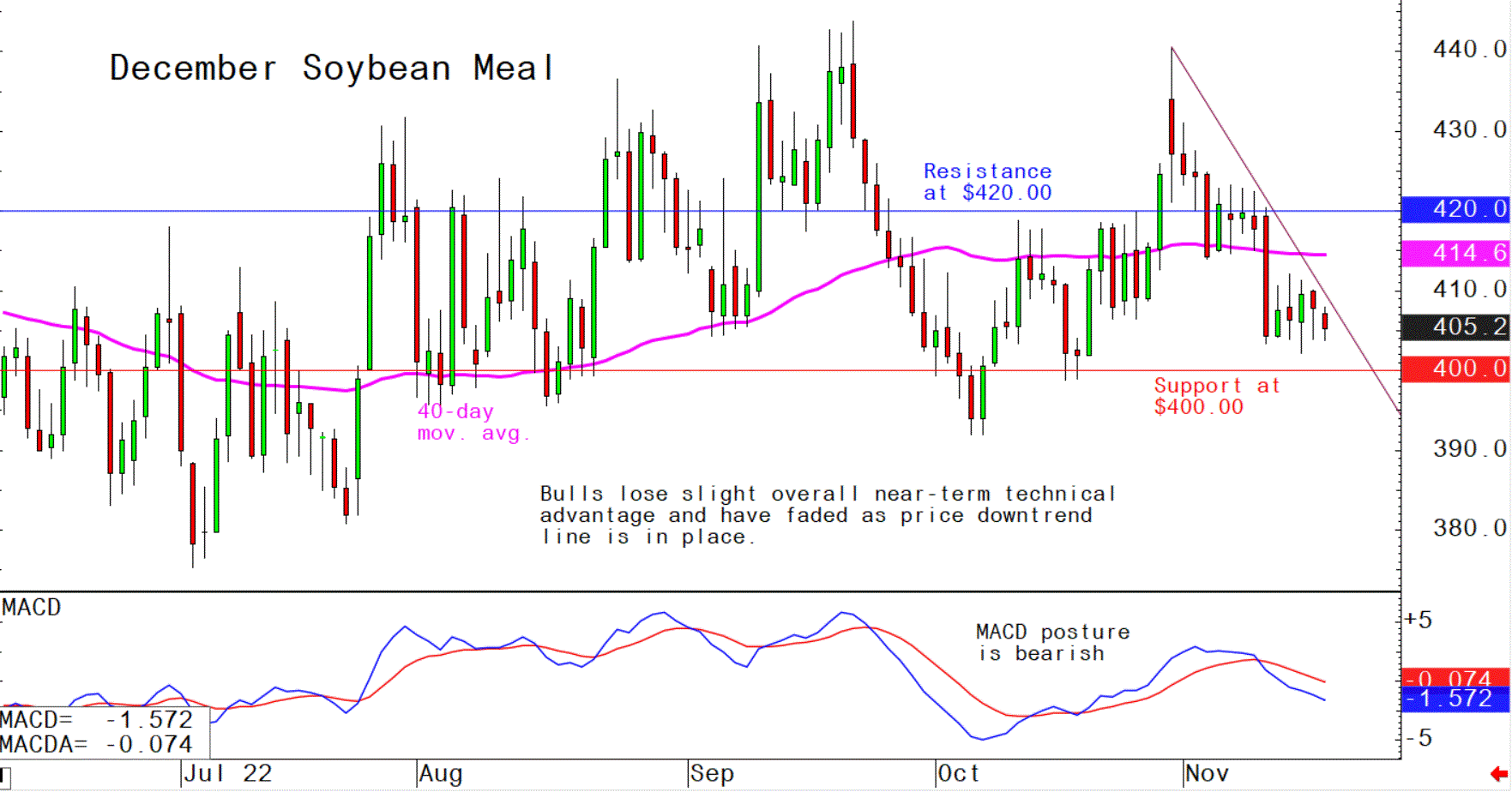 December soybean meal futures--$395.00 to $420.00, and with a sideways bias