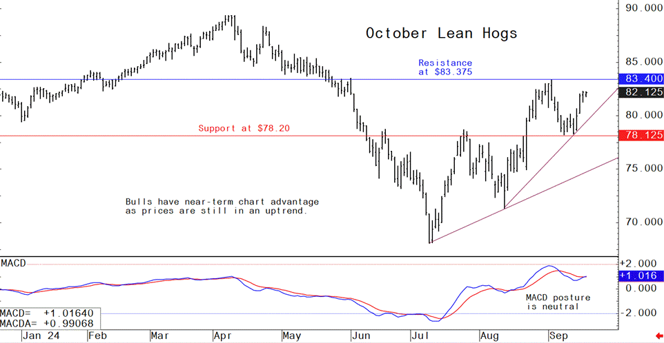 October lean hog futures--$78.20 to 85.00 and with a sideways-higher bias