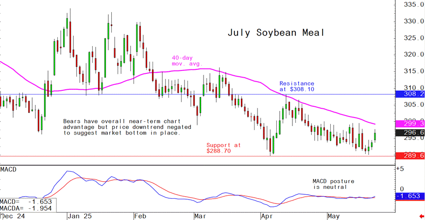 July soybean meal futures--$289.70 to $308.10, and with a sideways-higher bias