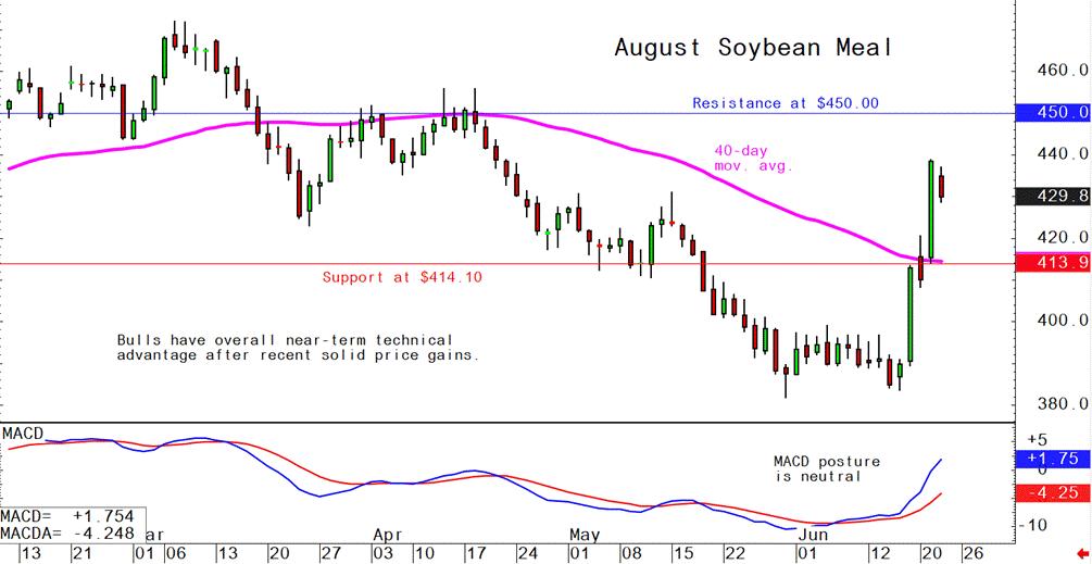 August soybean meal futures--$415.00 to $450.00, and with a sideways-higher bias