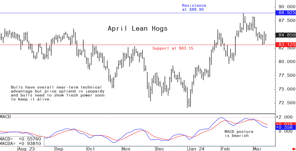Livestock analyst Jim Wyckoff reports on global pig newsApril lean hog futures prices are still in a 2.5-month-old uptrend on the daily bar chart. However, bulls need to show fresh power soon to keep their technical edge and to keep the uptrend in place. The latest CME lean hog index is up 20 cents to $81.61 (as of Mar. 11), while the preliminary calculation puts the index up another 41 cents Thursday, at $82.02. That would mark a new for-the-move high and the highest quote for the index since Oct. 12, 2023. The strength in the cash index suggests seasonal strength in the cash hog market will continue. Retailer demand for pork has been robust and is likely to continue to support cash market fundamentals in the near term.