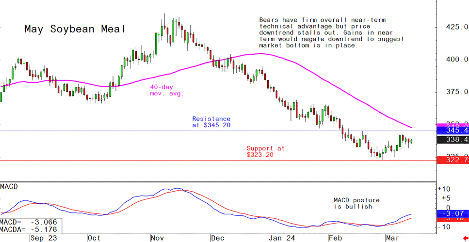 May soybean meal futures--$323.20 to $350.00, and with a sideways-higher bias