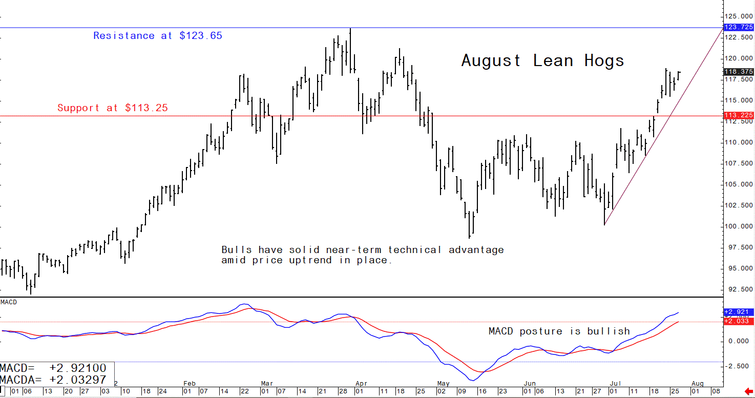 August lean hog futures--$113.25 to $123.65, and with a sideways-higher bias