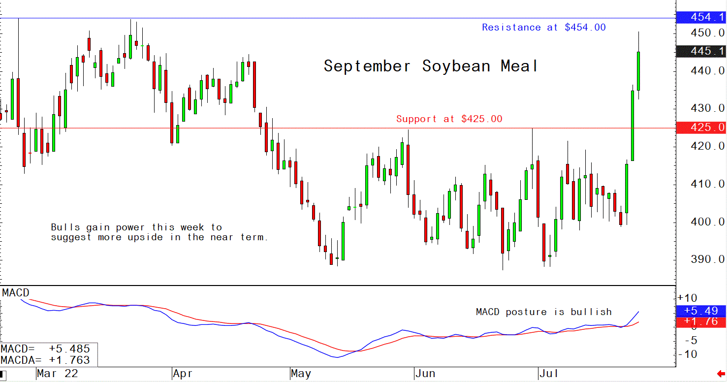 September soybean meal futures--$425.00 to $454.00, and with a sideways-higher bias