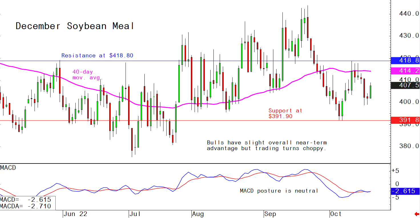 December soybean meal futures--$391.90 to $425.00, and with a sideways bias