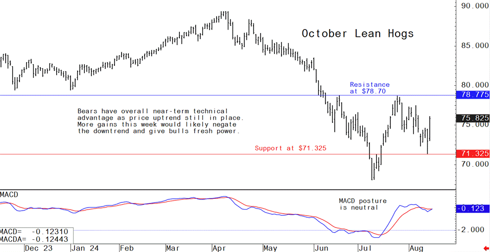 Livestock analyst Jim Wyckoff report on pig news from around the worldThe lean hog futures bulls showed renewed strength by pushing October futures solidly higher Wednesday. However, prices are still in a downtrend on the daily bar chart. Follow-through gains on Thursday would likely negate the price downtrend and give the bulls more technical power. Fundamentally, hog futures have been supported by stronger trade in the cash market. The latest CME lean hog index is down 58 cents to $90.34 as of Aug. 12. The preliminary calculation puts the index down another 16 cents to $90.18 as of today. Strength in the wholesale pork market has likely attributed strength in the cash index as strong grocer demand has stabilized pork cutout in the past few days.