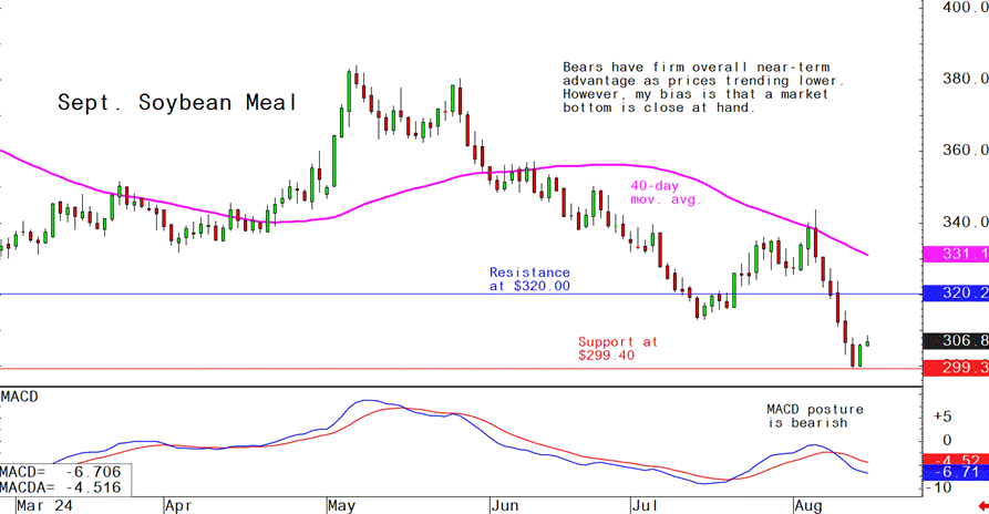 September soybean meal futures--$295.00 to $325.00, and with a sideways bias