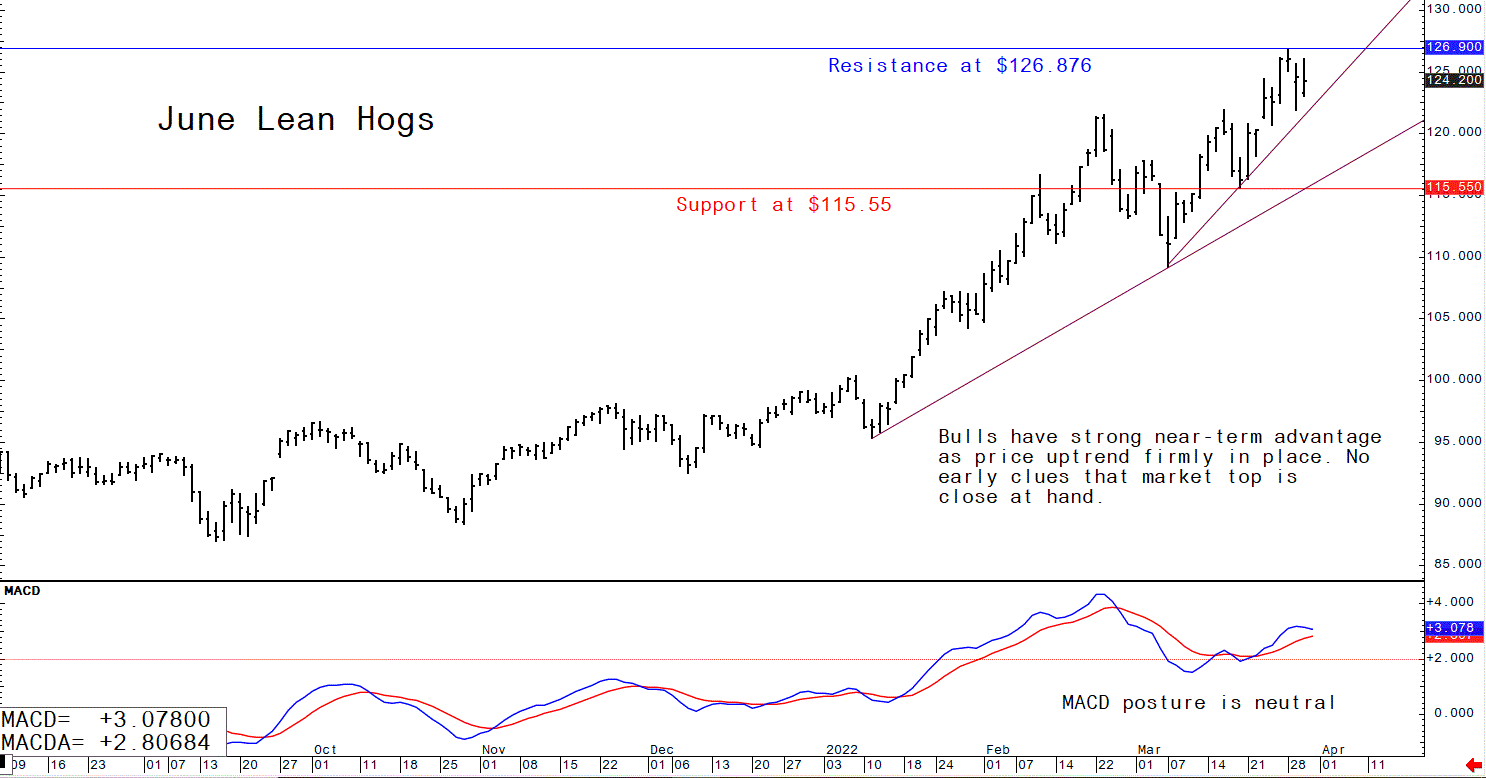 June lean hog futures--$115.55 to $130.00, and with a sideways-higher bias