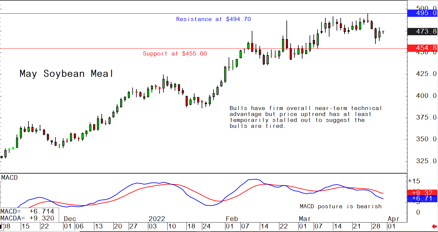 May soybean meal futures--$450.00 to $494.70, and with a sideways bias