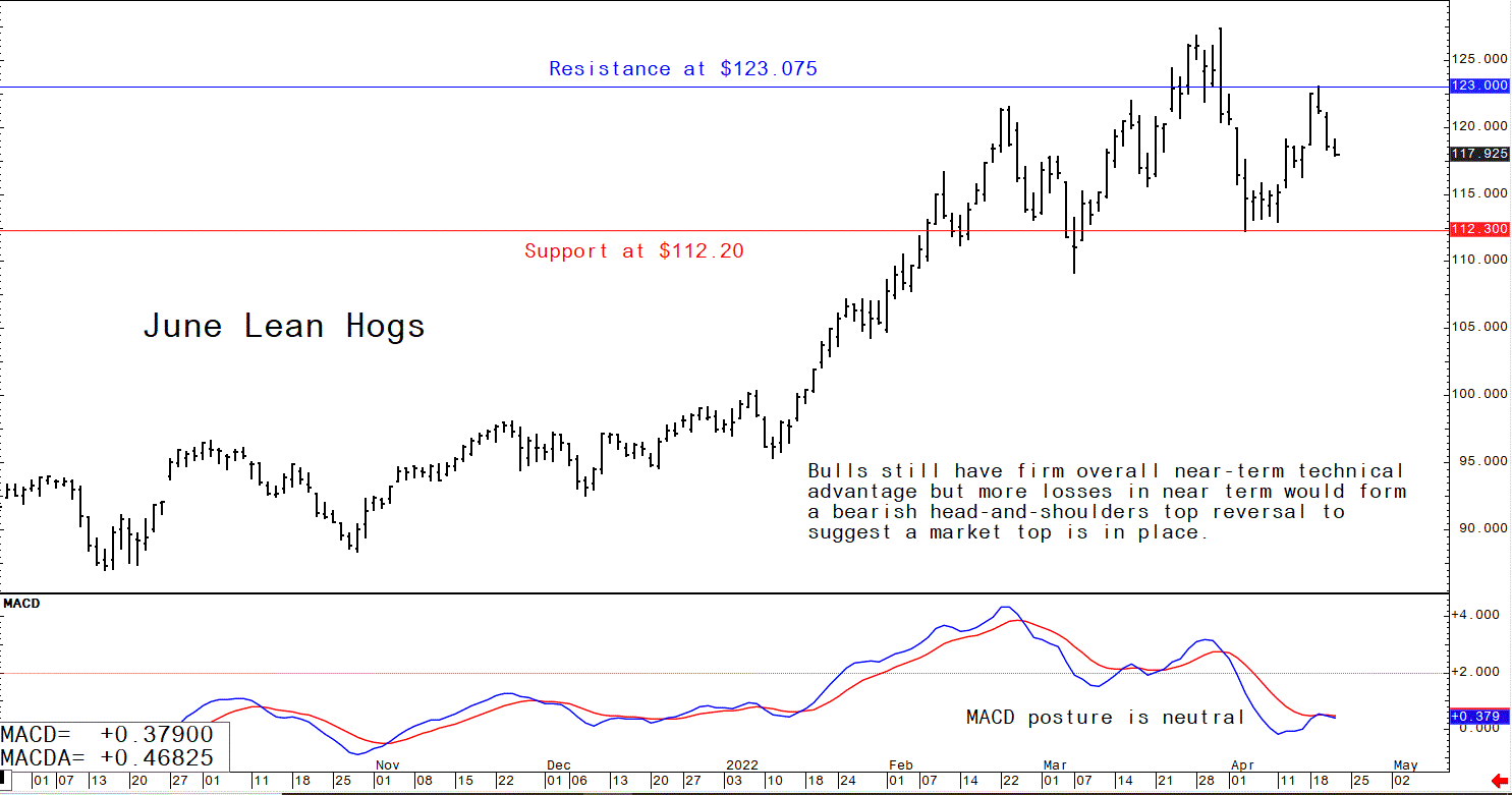 June lean hog futures--$115.00 to $123.075, and with a sideways bias