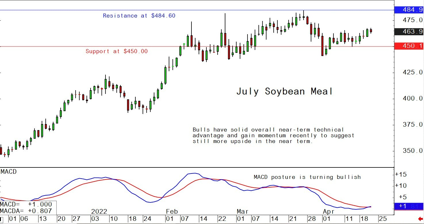 July soybean meal futures--$450.00 to $484.60, and with a sideways-higher bias