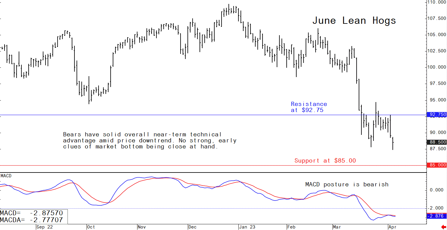 The lean hog futures market continues in a price downtrend on the daily bar chart and the bears have the solid near-term technical advantage. June lean hog futures this week hit a new contract low. The path of least resistance for prices remains sideways to lower in the near term. Fundamentally, the CME lean hog index extended its price slide for a 13th consecutive day, falling 76 cents to $73.91 (as of April 4). However, the premium in June hog futures is now less than $15.00, which signals traders anticipate a stronger-than-normal seasonal rally once the cash market finds its seasonal low. The five-year average rise in the cash index from now until mid-June is just under $10.00. A seasonal rebound is likely coming as hog slaughter typically turns lower beginning in early April, while consumer pork demand rises as grilling season begins.
