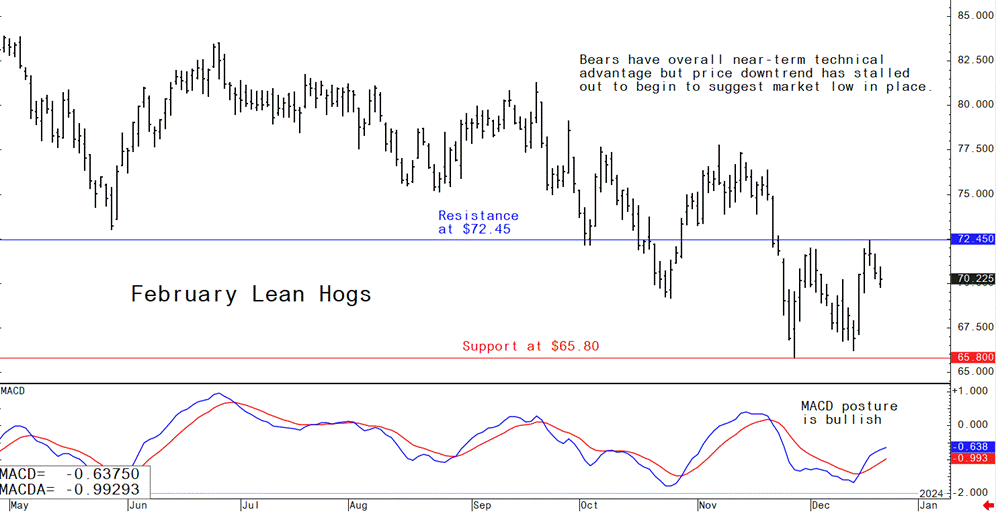 Livestock analyst Jim Wyckoff shares global swine newsLean hog futures prices the past three weeks have seen choppy trading at lower price levels, which begins to suggest a market bottom is in place. However, the bulls have more work to do to confirm such and to suggest a price uptrend can be sustained. The latest CME lean hog index is up 17 cents to $66.54 (as of Dec. 19). It’s also going to take sustained price gains in the cash index to convince traders a seasonal low is in place.