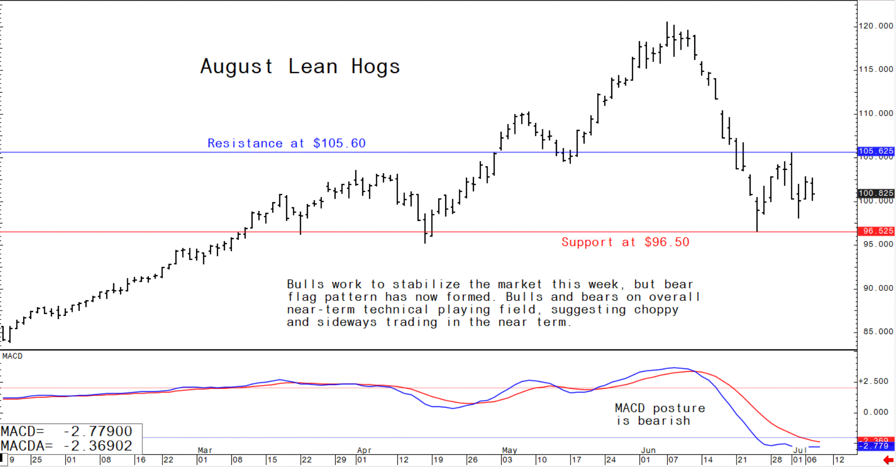 August lean hog futures--$96.50 to $105.60 and with a sideways bias