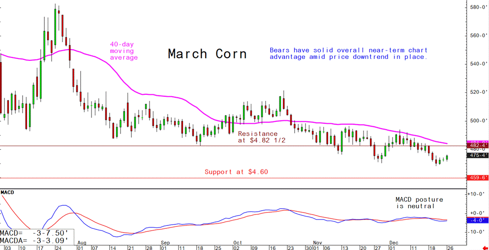March corn futures--$4.60 to $4.85 and a sideways-lower bias