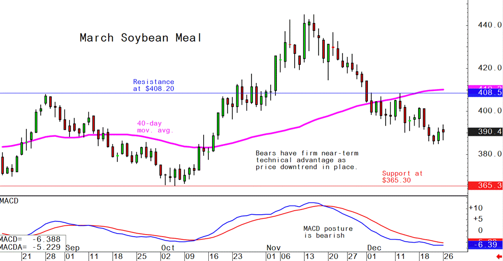 March soybean meal futures--$365.30 to $405.00, and with a sideways-lower bias