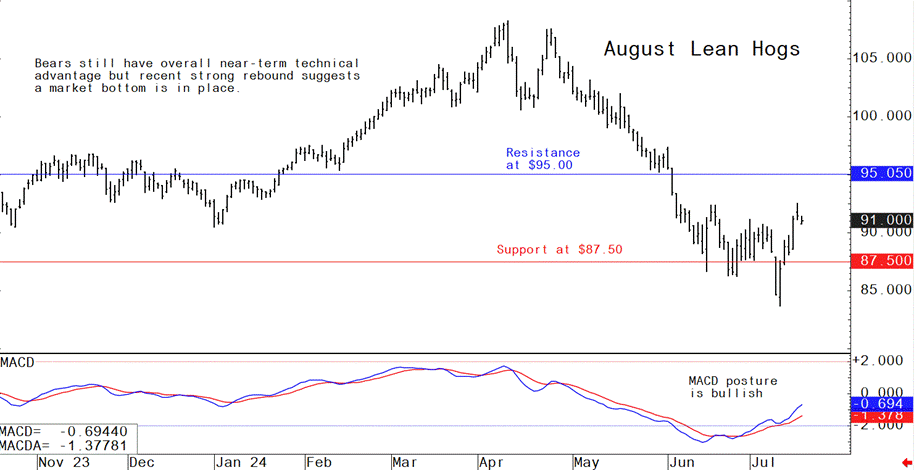 Jim Wyckoff reports on the latest USDA and other news regarding the global pork industryAugust lean hog futures this week have seen a strong rebound after hitting a contract low on July 11. Technical factors suggest a near-term market bottom is in place. Cash market fundamentals are also improving. The latest CME lean hog index is up 18 cents to $88.80, as of July 16, marking the first three-day string of gains since late-May/early June. August lean hog futures finished Wednesday at a $2.85 premium to the cash index.