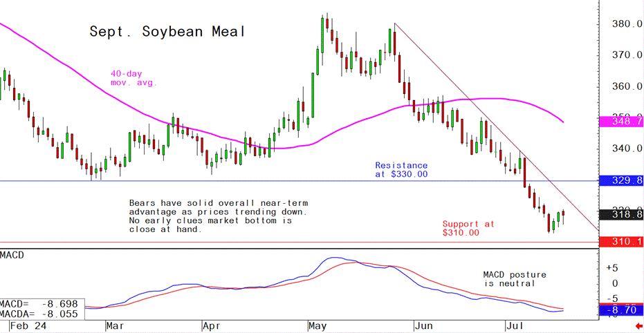 September soybean meal futures--$310.00 to $332.00, and with a sideways bias