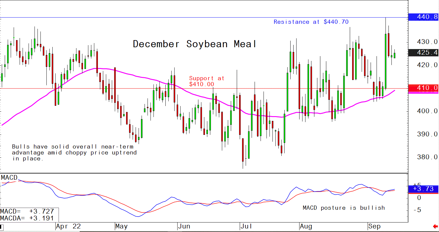 December soybean meal futures--$405.00 to $440.70, and with a sideways-higher bias