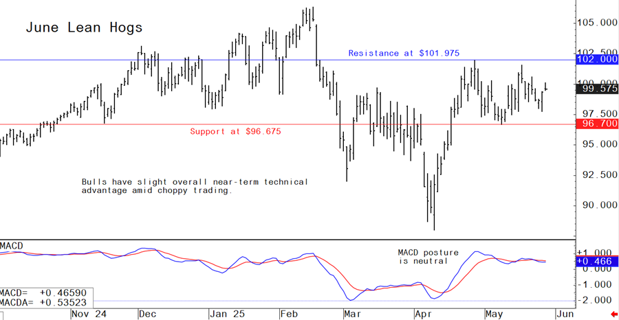 June lean hog futures--$97.75 to $101.975 and with a sideways bias