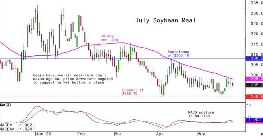 July soybean meal futures--$289.70 to $308.10, and with a sideways bias