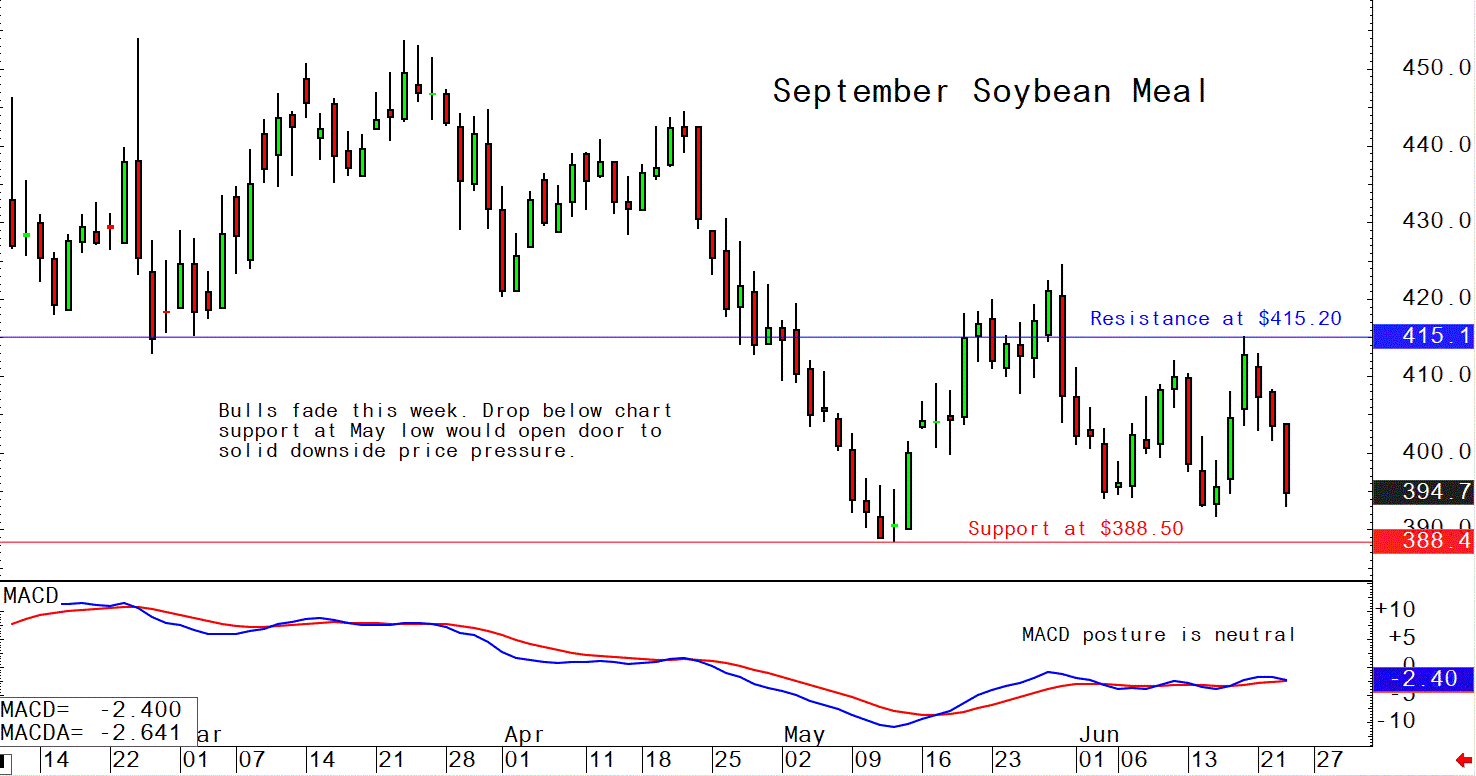 September soybean meal futures--$391.30 to $406.90, and with a sideways-lower bias