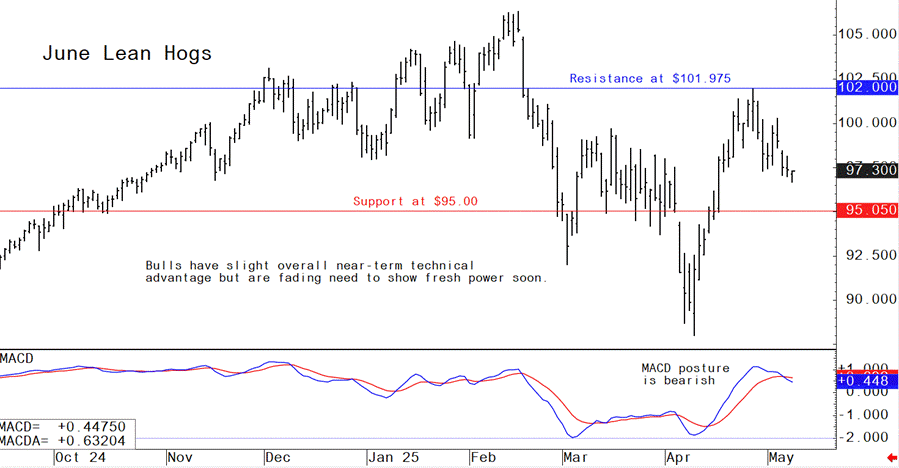 June lean hog futures--$95.00 to $101.975 and with a sideways bias
