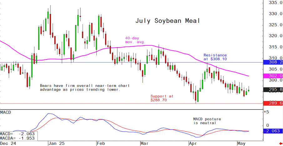 July soybean meal futures--$289.70 to $308.10, and with a sideways bias