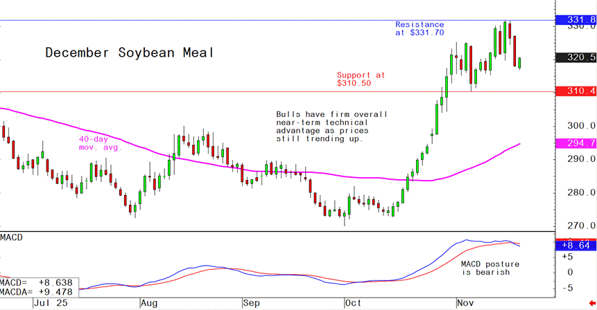 December soybean meal futures--$310.50 to $330.00, and with a sideways bias