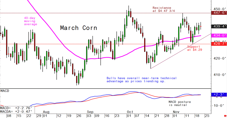 March corn futures--$4.29 to $4.47 3/4 and a sideways-higher bias