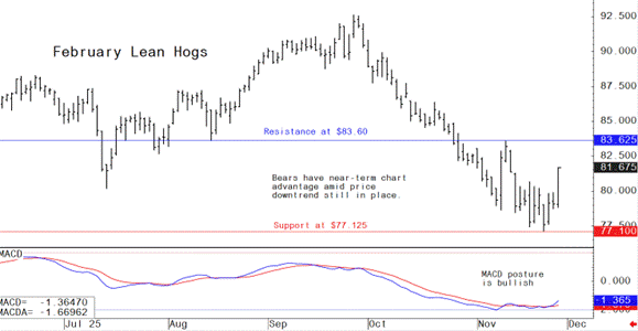Lean hogs see heavy short covering. February lean hog futures rose $2.375 to $81.375 on Wednesday and hit a two-week high. Hog futures saw solid short covering and perceived bargain buying following recent losses. Strong gains in the cattle futures markets Wednesday also spilled over into buying interest in lean hog futures. Still, steadily declining cash hog prices will limit the upside in futures, until the cash market stabilizes and starts to turn back up. The latest CME lean hog index is down another 80 cents to $82.81. Friday’s projected cash index price is down another 54 cents at $82.27. Wednesday’s national direct 5-day rolling average cash hog price quote is $70.92.