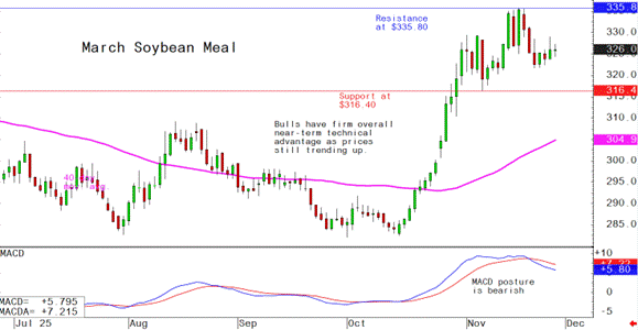 March soybean meal futures--$321.80 to $340.00, and with a sideways-higher bias