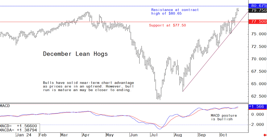 Jim Wyckoff reports on global pig newsDecember lean hog futures this week hit a 15-month high. Bulls are in solid technical control, but the bull run is mature now, suggesting the market may be close to topping out in the coming weeks. The contra-seasonal gains in lean hog futures are being fueled by strength in the cash hog and pork product markets. The latest CME lean hog index is up another 32 cents to $84.66 as of Oct. 22, the four straight daily gain. With US hog numbers continuing to fall far short of USDA forecasts for a 3.5% to 5% rise in hog supplies through the September-November period, as exemplified by slaughter totals falling below year-ago levels in four of the past five weeks, hog traders continue buying futures.