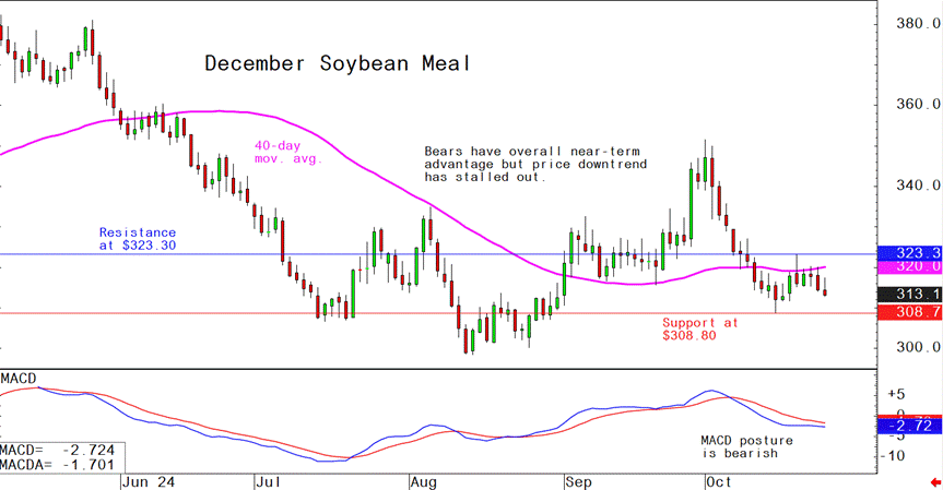 December soybean meal futures--$308.80 to $323.30, and with a sideways bias