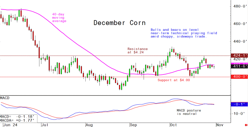 - December corn futures--$4.00 to $4.24 and a sideways bias