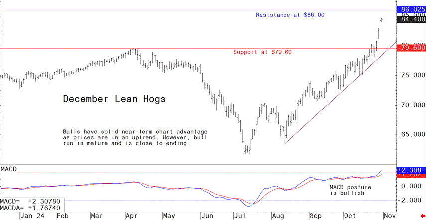 Livestock analyst Jim Wyckoff reports on global pig newsDecember lean hog futures prices this week soared to a contract high amid a steep price uptrend in place. Bulls are presently strong, but this week’s big gains suggest that a market top is now not far off. December lean hogs are technically overbought on the daily bar chart. The latest CME lean hog index is up another $1.05 to $86.78 as of Oct. 29, extending the string of gains to nine consecutive days, during which the index has jumped $2.92. Wholesale pork prices are also strong.