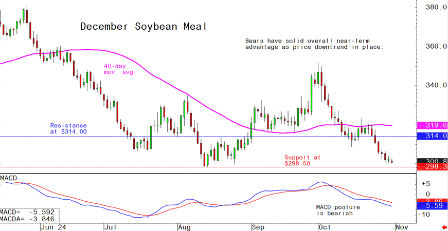 - December soybean meal futures--$298.50 to $315.00, and with a sideways bias