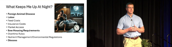 “When I was asked to do this presentation, I started by creating a list of the challenges that I see in the industry – essentially, the things that kept me up at night,” he said. “It’s all the things that I spend a lot of time thinking about as I'm driving down the road. I decided to focus on four aspects that probably affect everyone fairly equally – foreign animal disease, labor, sow housing requirements and disease, more specifically, PRRS which is always the elephant in the room.”