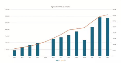Part of the struggle is getting a local labor pool. The chart below shows the number of visas that have been issued since 2011. The blue lines are TN visas, and the orange line is for H-2A visas. There’s a steep increase in both of those categories as farms struggle to find labor