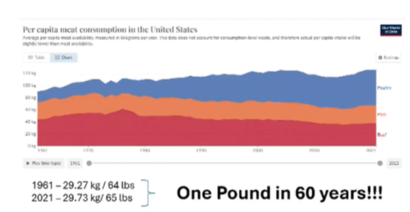 The graphic below shows US per capita meat consumption over the last 60 years.