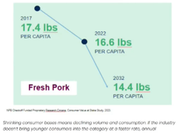 Last year, the National Pork Board commissioned research looking at the demand for pork among the next generations of consumers. The results show that per capita consumption of pork is expected to decline by about 3 lbs. 2017 to 2032.