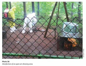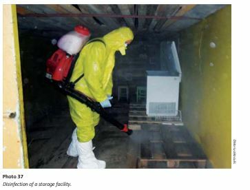 In the event of a positive ASF result, all the stored carcasses (or pieces of meat) must be safely disposed of by the veterinary service. The dressing area, cold storage facilities or refrigerator must also be cleaned and disinfected. Since the inactivation of the virus in the dressing area, in refrigerators and from clothes, vehicles and tools is based on cleaning and disinfection, hunters should be trained and provided with written instructions. Preliminary cleansing is needed before the use of any disinfectants. Mechanical brushing with a detergent solution is highly effective in cleaning contaminated surfaces and objects and is important for disinfection to be effective. Only freshly prepared disinfectant solutions should be used and for the required time necessary to be effective (up to 60 minutes contact time).