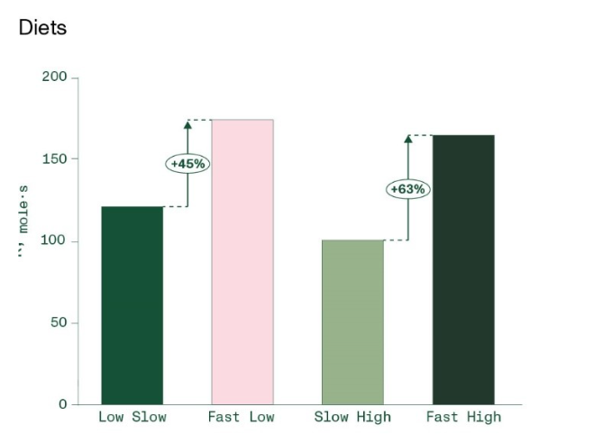 Next step in our process was to check whether the inclusion of either HP300 or SPC was enough to create protein kinetics differences in the final diets. And the results were very good. There was a 45% difference in protein digestion speed between SLOW-LOW and FAST-LOW and a 63% difference in digestion speed between SLOW-HIGH and FAST-HIGH which was sufficient to provide digestion speed contrast in the in-vivo trial (Figure 1).