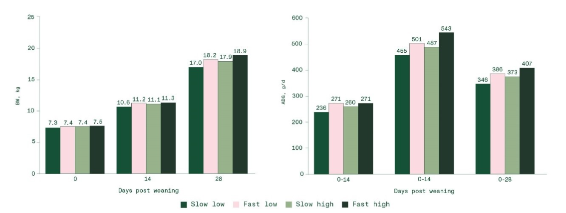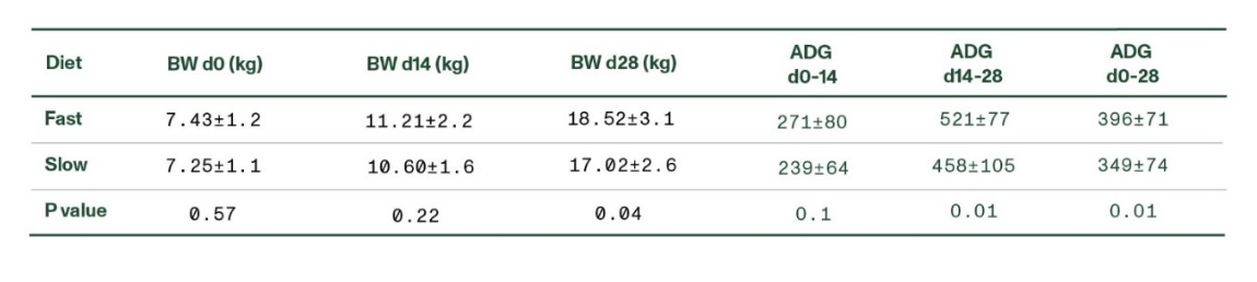 Now, we were ready to go to real practice to see whether weaned pigs on a diet with fast protein outperformed pigs on a diet with slow protein. To test this we formulated 4 diets, using as the differentiating protein source either HP300 (fastest vegetable protein) or a soy protein concentrate (SPC), that was previously tested as very slow (Table 1, Figure 1A). The 4 diets differed in protein source but also in protein level (16 vs 19%), so creating SLOW-LOW, SLOW-HIGH, FAST-LOW and FAST-HIGH (see Table 1). All diets were supplemented with synthetic amino acids to meet the requirements.