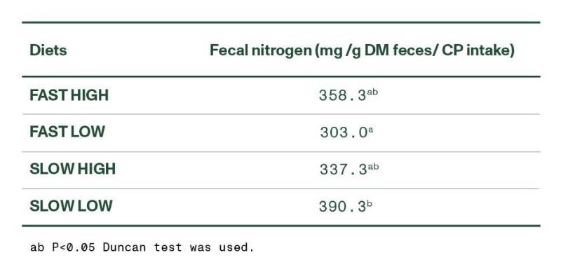 What was very interesting to see when looking at the individual diets (Figure 2A&B) is that FAST-LOW numerically outperformed the growth performance of SLOW-HIGH. Even at lower protein levels (16% vs 19% CP) the FAST-LOW showed higher BW and better ADG. So, this means that using a fast protein source one can lower crude protein levels without losing performance. This is probably related to a better synchronization in absorption with the supplemented synthetic amino acids in the diet. Zhang et al., 2022 showed that the better the synchronization in absorption of total amino acids is the higher the nitrogen deposition rate and the higher the apparent biological value of the protein source is. This indicates that faster protein is better utilized than slow protein. This was confirmed by lower nitrogen levels in feces for FAST diets. Average nitrogen levels in feces from D14-28 tended to be lower for FAST compared to SLOW (326 vs 343 mg/g DM feces/CP intake, P=0.1). On D28 FAST-LOW had less nitrogen (mg/g)/DM feces/CP intake than SLOW-LOW (303 mg vs 390 mg, P<0.05, respectively). So, from fast protein less nitrogen is wasted. Therefore, protein kinetics are more indicative of feed efficiency and protein deposition than the digestibility coefficient of the protein ingredient.