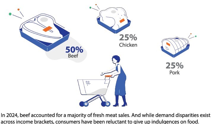 The beef cowherd size has been decreasing since 2019, leading to supply constraints. However, consumers have maintained their beef purchases despite economic difficulties, resulting in higher prices due to the combination of limited supply and robust demand.