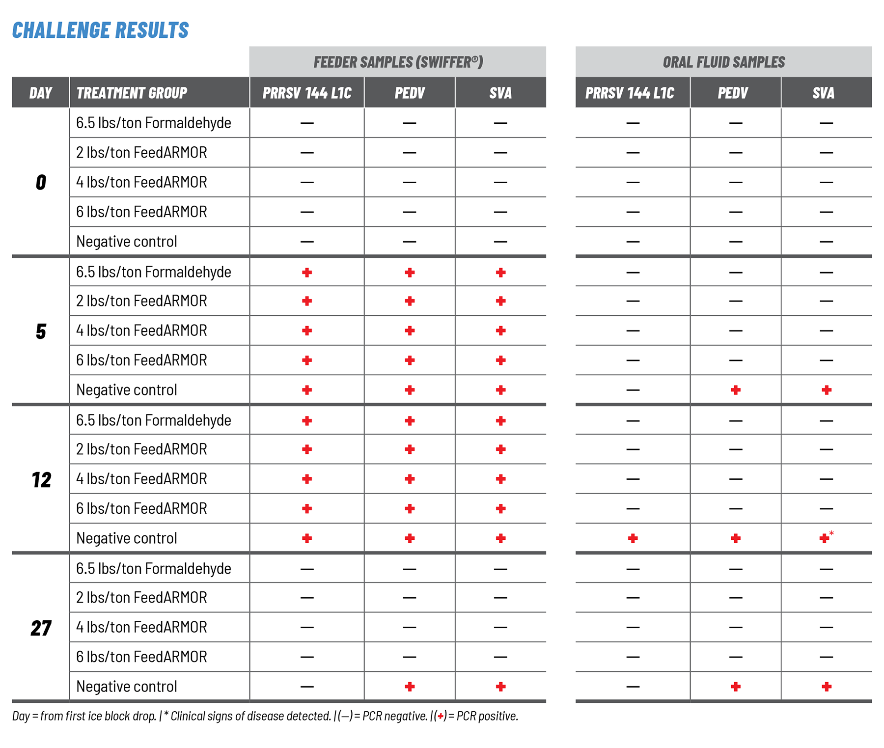 - On Day 27, PEDV and SVA RNA were detected in only the negative control feed sample. Oral fluid samples taken on Day 27 were negative for PEDV and SVA in sows consuming feed supplemented with FeedARMOR at all inclusion rates and the formaldehyde-based mitigated feed. The untreated control group tested positive for PEDV and SVA.